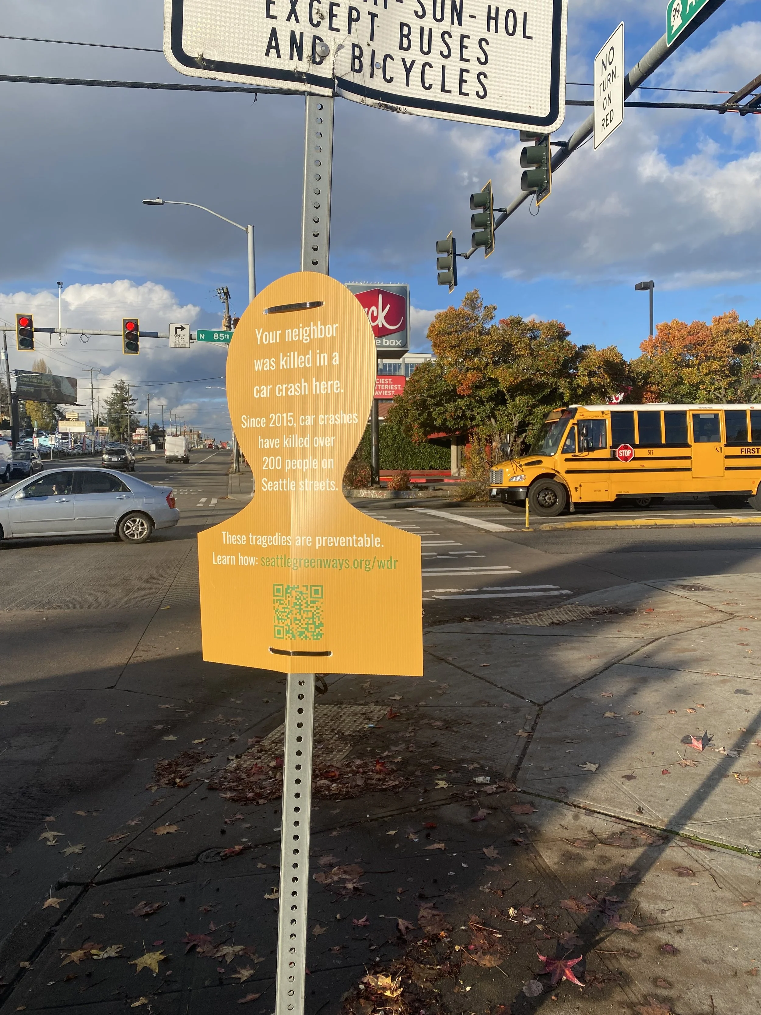 Seattle Neighborhood Greenways will be hanging these signs at the 226 crash sites where people have lost their lives since Seattle committed to Vision Zero in 2015.